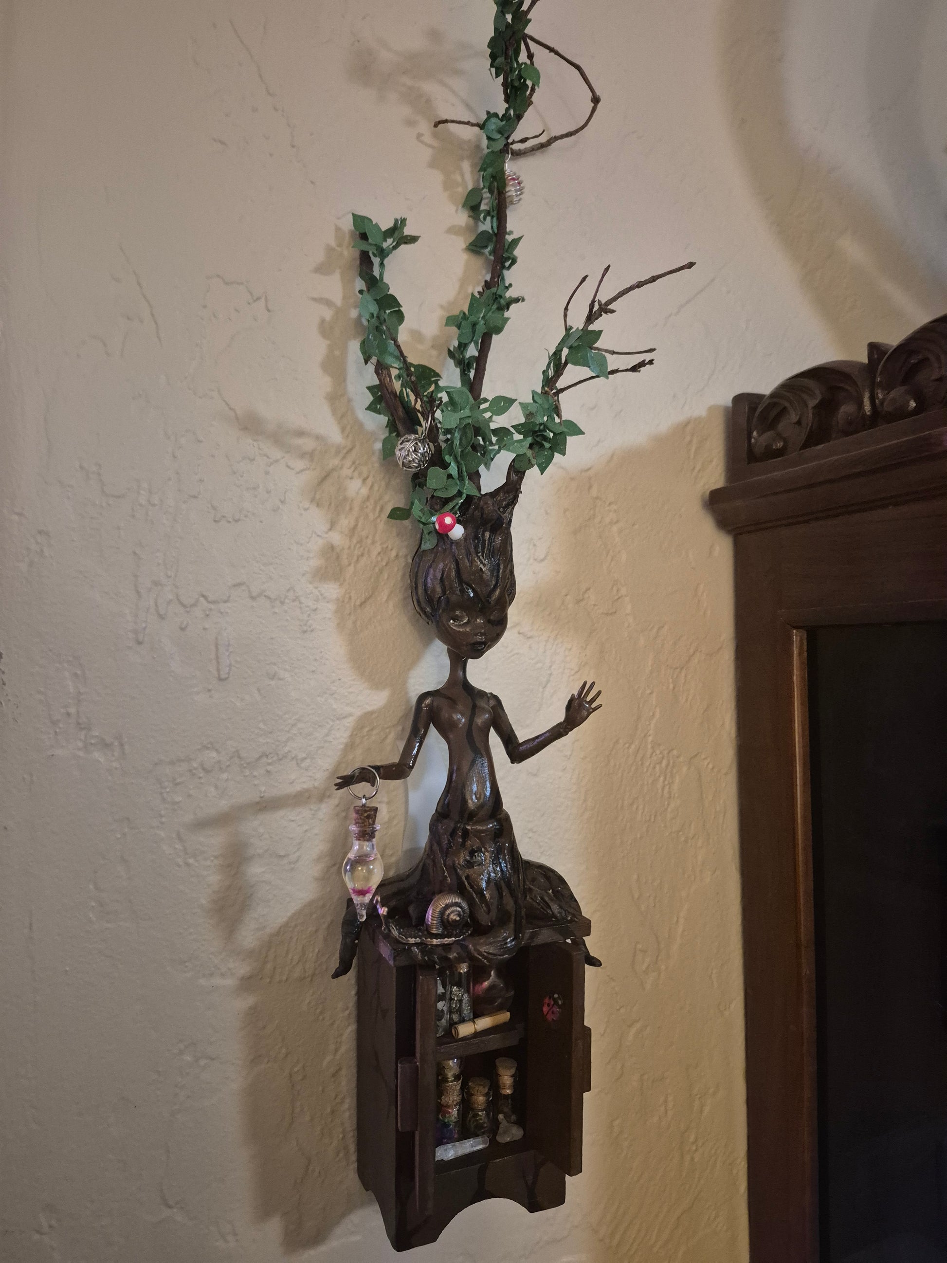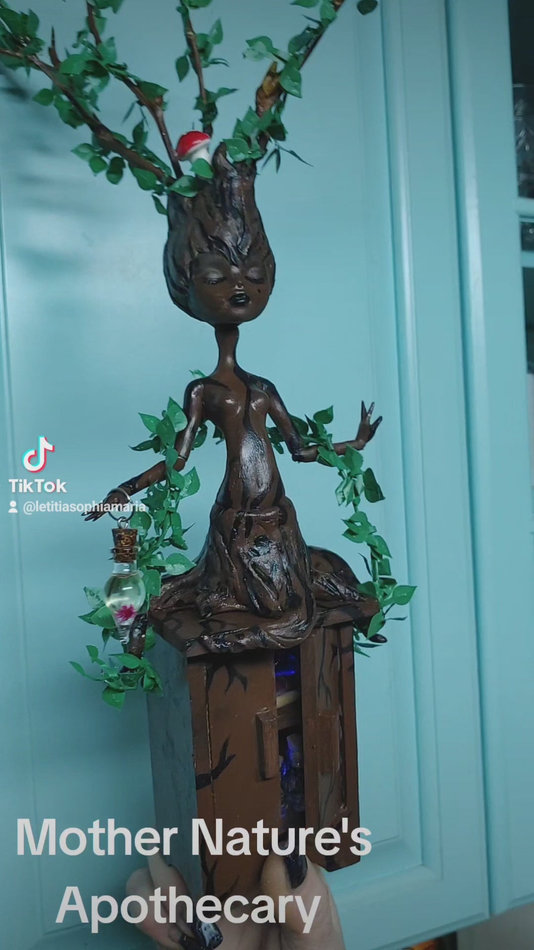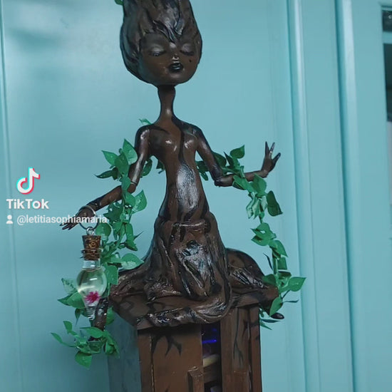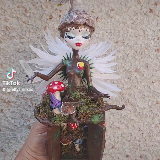 These Fairies are made with a spell of abundance and protection. Comes with her own apothecary filled with mushrooms , herbs for protection and crystals. Comes with a diffusing potion bottle with your choice of potion. Comes with or without lights