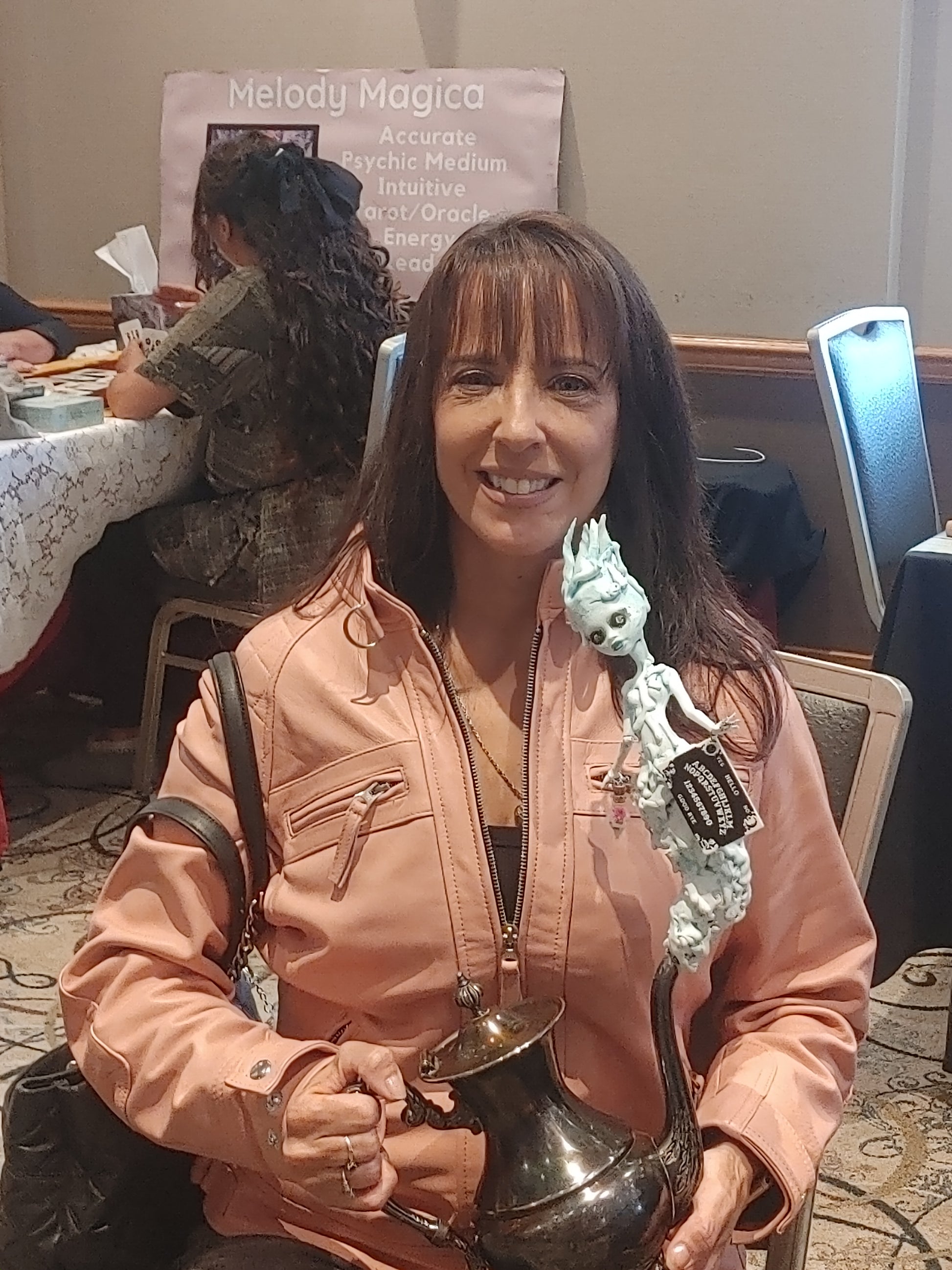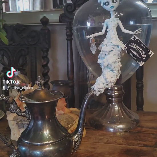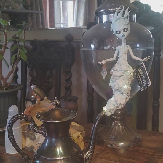 Did this ghost come by to haunt you or does she just want to have tea and chat? Can come without teapot for a reduced price. Comes with her tea pot. She lights up with three different settings and glows in the dark. Comes with a glowing and diffusing potion bottle with your choice of potion.